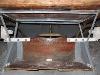 Steering ? I’m sure it is important, but really ; it has to be so involved ? It is a boat for christ sake ! So it goes like this the floor holding up the steering column has to be strengthened and made to where it will not flex when turning the wheel for the rudder. So in the photos below you will see we have added a steel frame that will have steel supports going to the frame below and attaching to the bottom of the column . This will stop the floor from flexing side to side, a rope is attached to a chain from the steering column and down to the four pulley’s below , so when you turn the wheel and the rope is engaged through the pulley’s they will not pull on the floor from left to right and cause it to flex. Now that this is done we have the matter of making a spot for the emergency tiller , So this means another hole in the cockpit, more epoxy more fiberglass , with a dash of sanding and to just repeat the process over and over, Oh how the fun just keeps going, are we ever going to get out of this cockpit. It looks as though our deadline of September to have the topside sanded and filler added with the paint done look very bleak. But we have surprised ourselves .