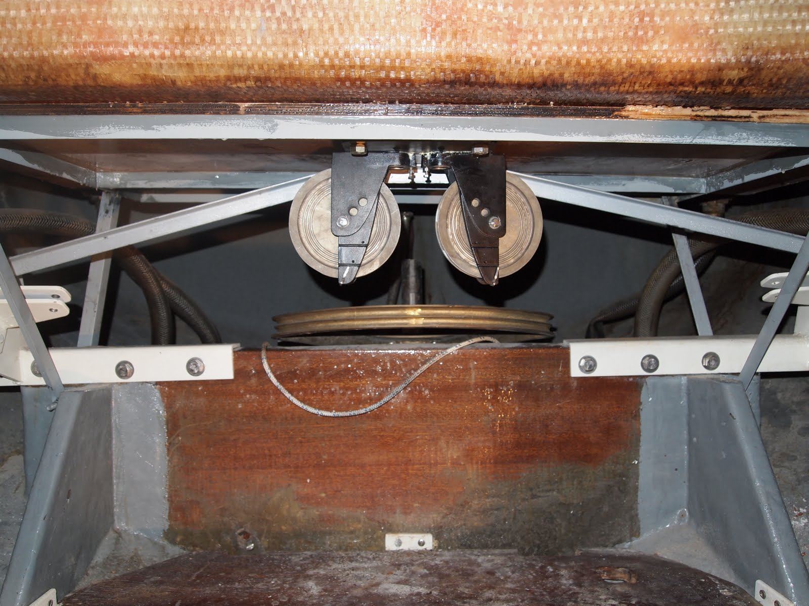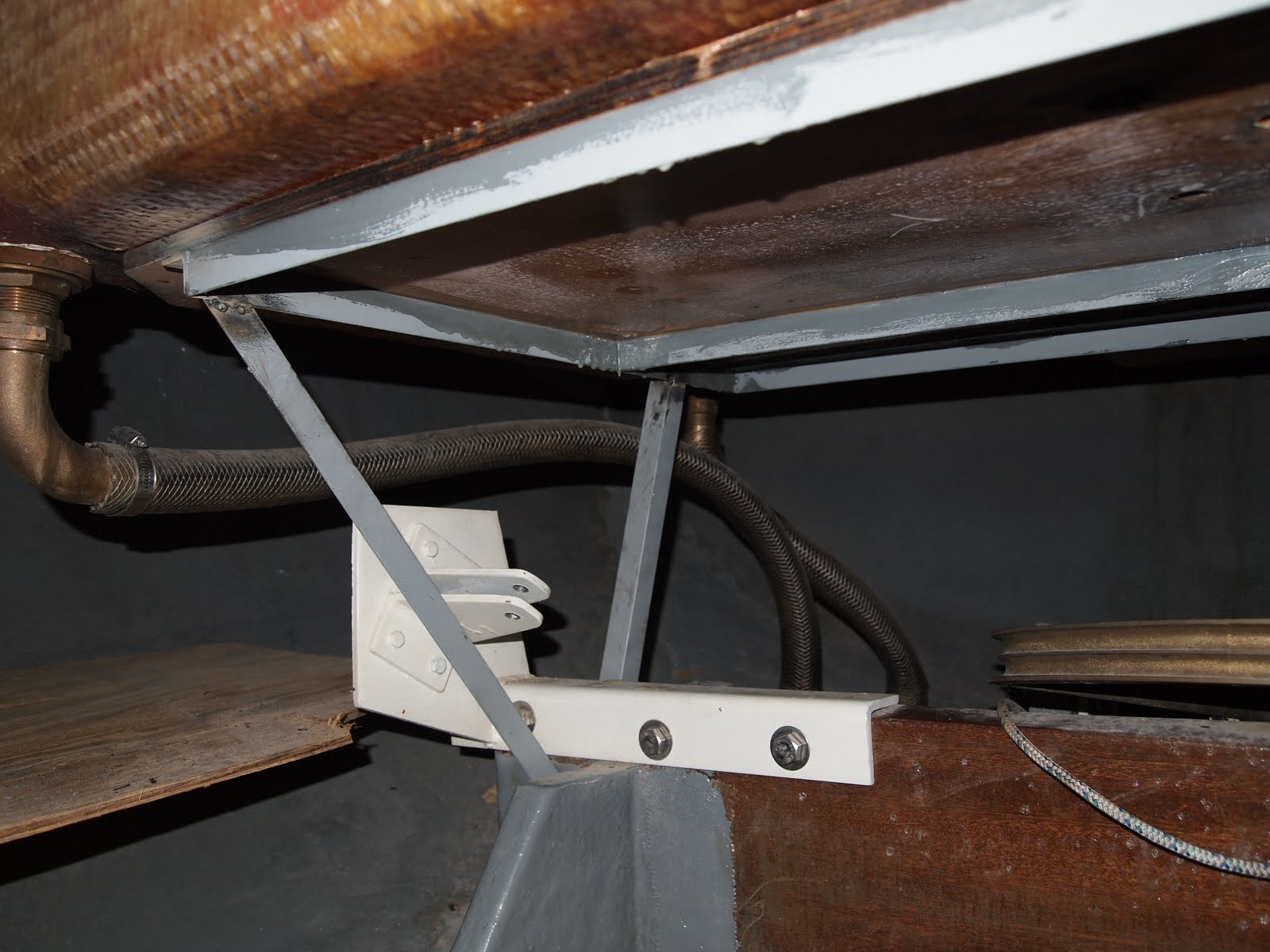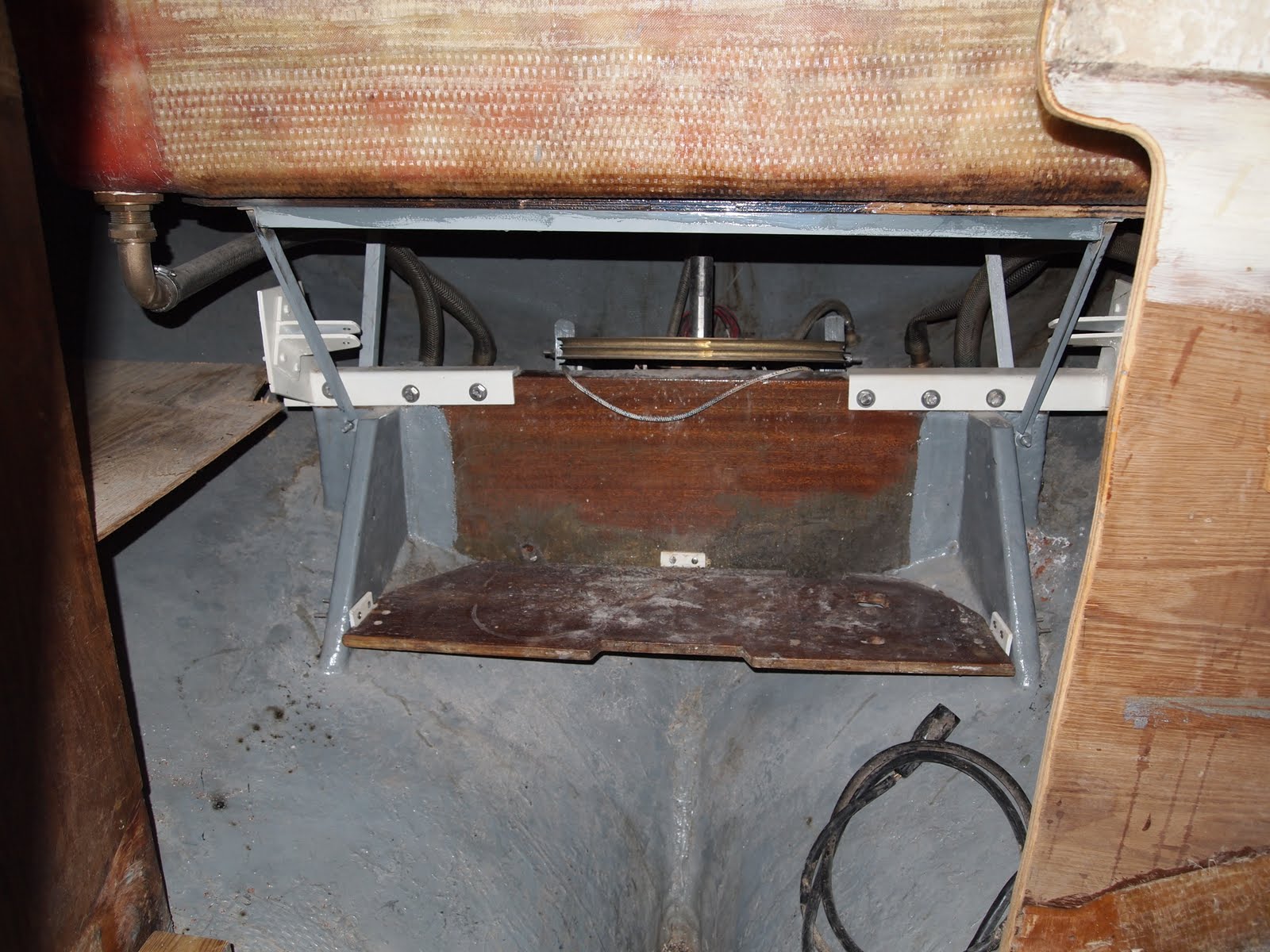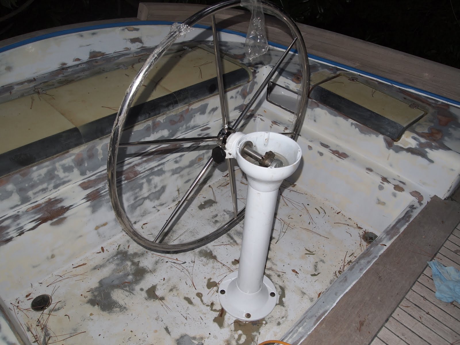 Steering ? I’m sure it is important, but really ; it has to be so involved ? It is a boat for christ sake ! So it goes like this the floor holding up the steering column has to be strengthened and made to where it will not flex when turning the wheel for the rudder. So in the photos below you will see we have added a steel frame that will have steel supports going to the frame below and attaching to the bottom of the column . This will stop the floor from flexing side to side, a rope is attached to a chain from the steering column and down to the four pulley’s below , so when you turn the wheel and the rope is engaged through the pulley’s they will not pull on the floor from left to right and cause it to flex. Now that this is done we have the matter of making a spot for the emergency tiller , So this means another hole in the cockpit, more epoxy more fiberglass , with a dash of sanding and to just repeat the process over and over, Oh how the fun just keeps going, are we ever going to get out of this cockpit. It looks as though our deadline of September to have the topside sanded and filler added with the paint done look very bleak. But we have surprised ourselves .