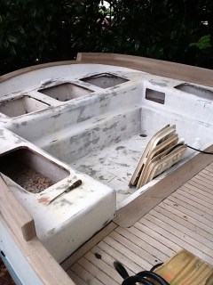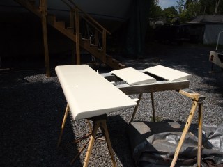 I will not take any credit for this part of the project . Burt took some time off and was able to get the prep work done along with Painting . He will sand one more time and add another coat. The color we chose is what we used on our 1966 Morgan , it is Hatteras off white by interlux . We have found that the white is blinding in the sun , so to tone that down we went with a darker shade and this seems to work well when we take the morgan out for a sail .