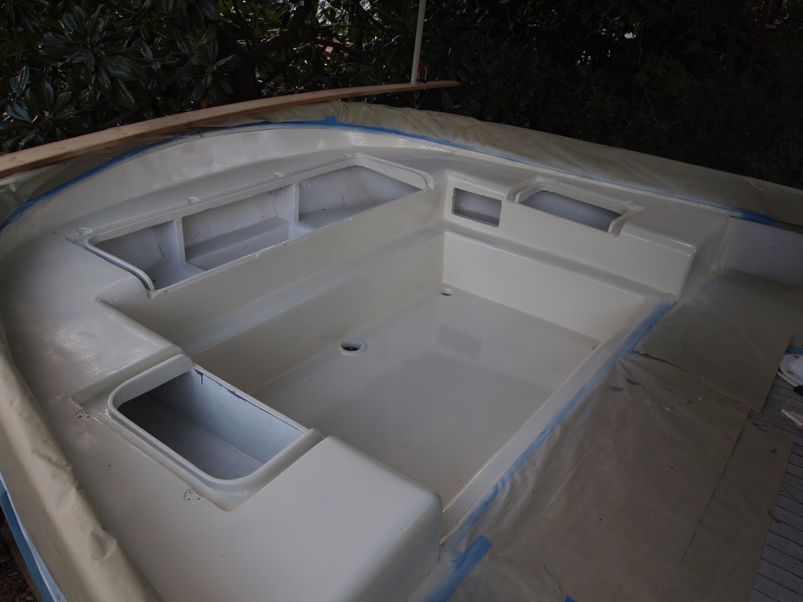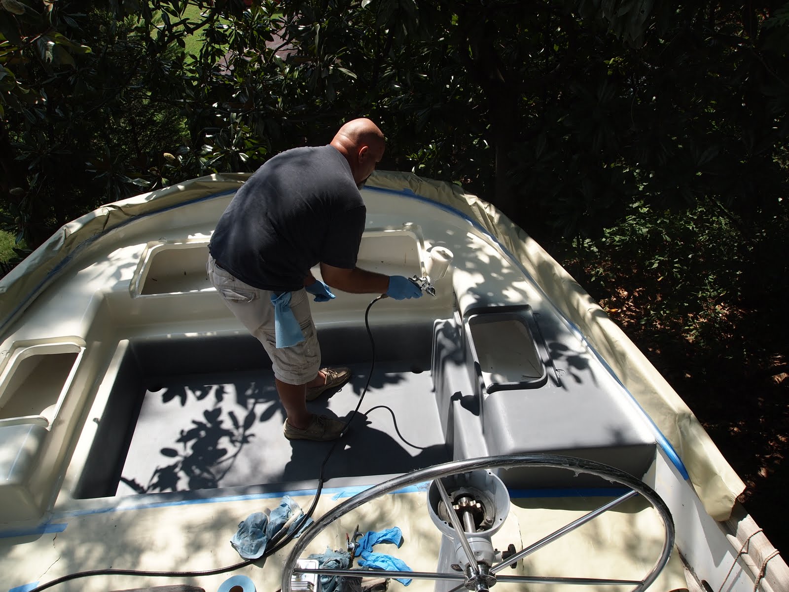 I will not take any credit for this part of the project . Burt took some time off and was able to get the prep work done along with Painting . He will sand one more time and add another coat. The color we chose is what we used on our 1966 Morgan , it is Hatteras off white by interlux . We have found that the white is blinding in the sun , so to tone that down we went with a darker shade and this seems to work well when we take the morgan out for a sail .