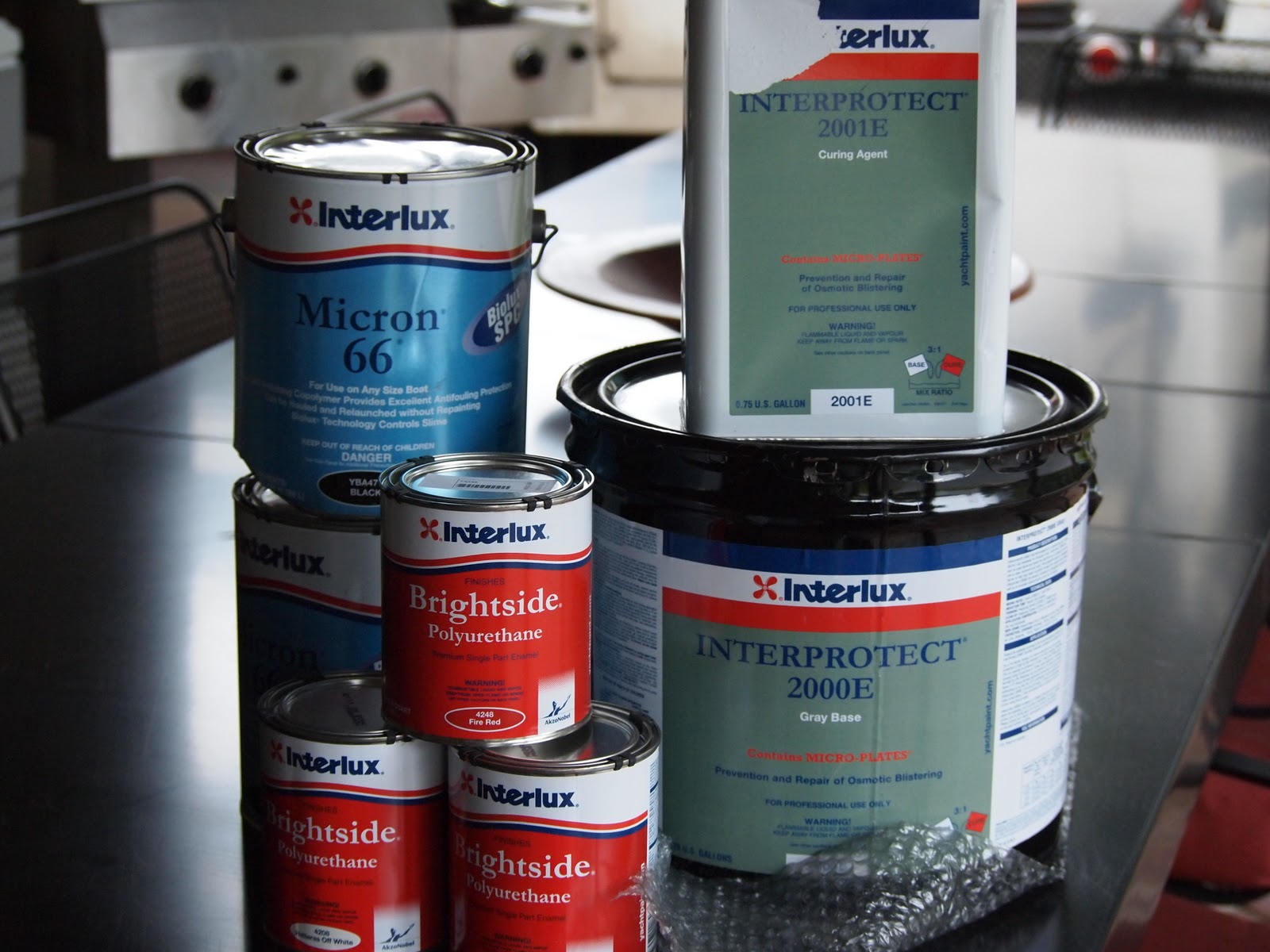 During this process we have made our order for the paint . This picture below shows one order , And as the accountant I will say this order was $1000 and we are missing about $30 of paint left to order. As you can see we like and choose to use the Interlux brand. Below you will see a two part primer with micro platelets , this will inhibit the migration of water , and the micron 66 has copper and biocides . This will lengthen the life of the paint for at least two seasons .
