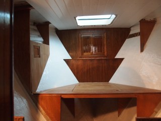 Here you will see the hull has been coated and painted . In this photo you will see the chain locker has been built and varnished , below is what we call the head board to the bed . This also opens up and has storage and access to the drain. Below that is the first part of the bed with an access door for more storage under the bed. On both sides of the hull we are closing this in with more storage.