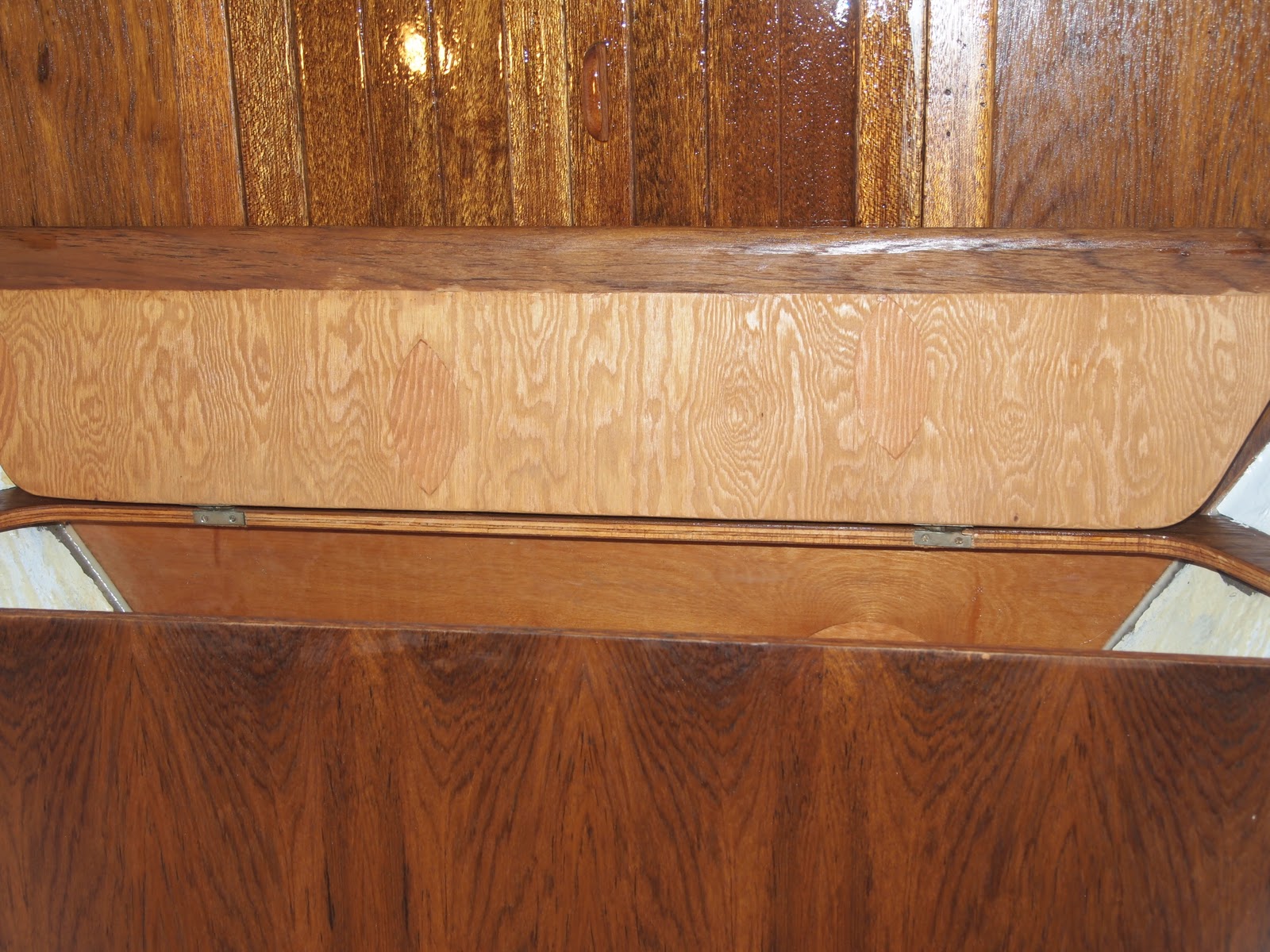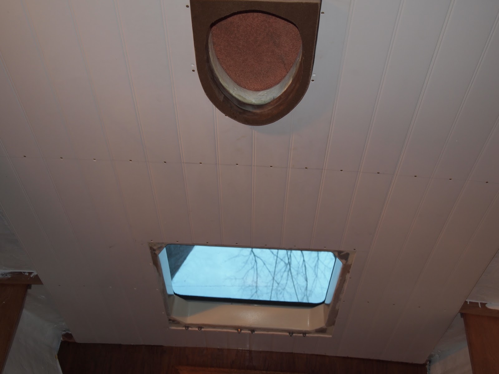 Here is what we are doing with the ceiling and walls. This is a product we found it looks like wood bead board, but it is made from plastic , cuts well bends well and will not rot. We also found this same product that is also made from plastic and we are using that along with teak to epoxy to the hull for mounting wall , ceiling, cabinets , etc.