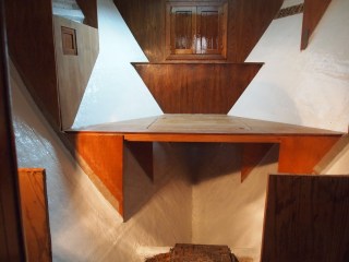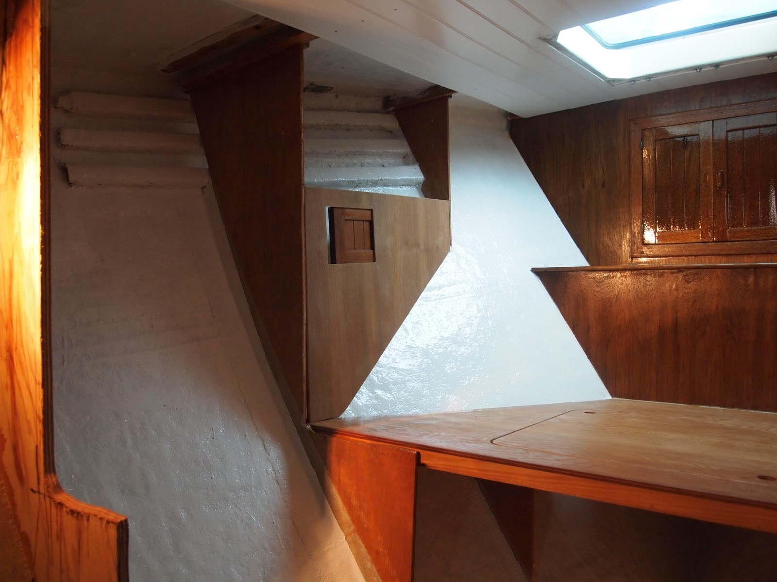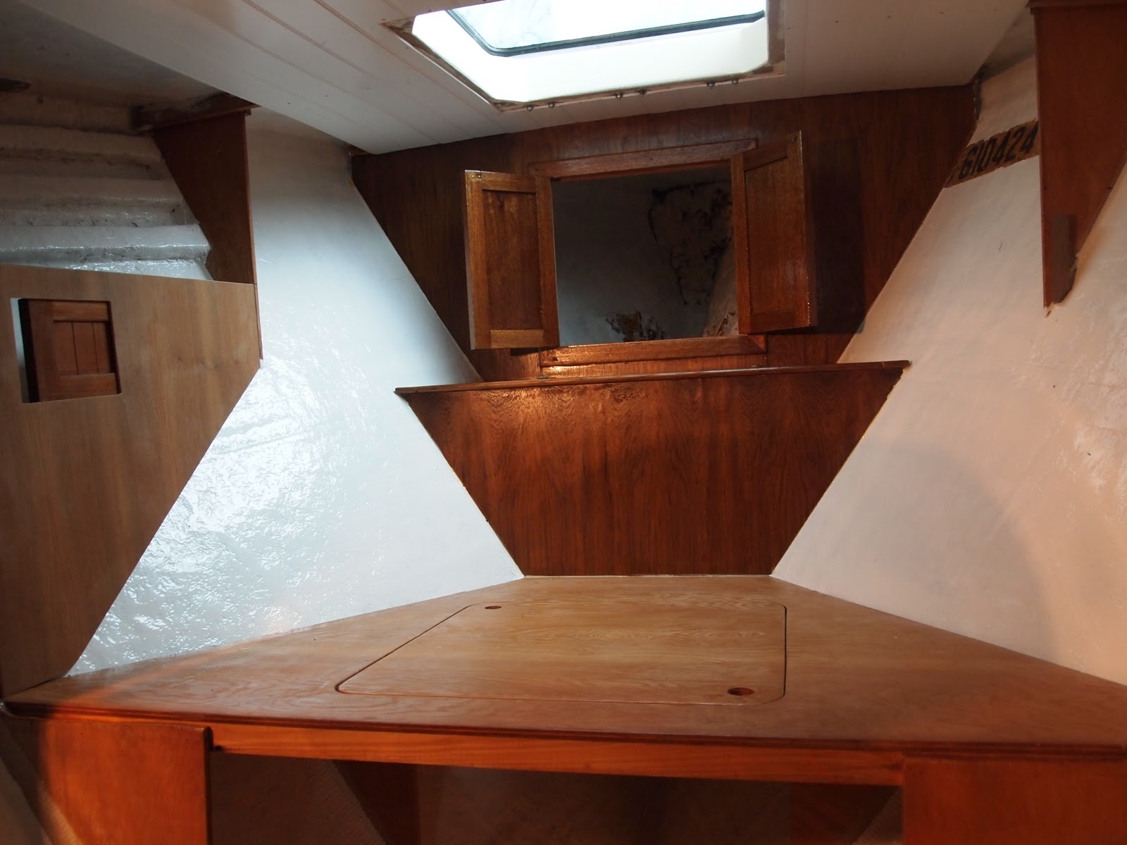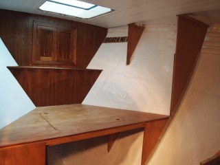 Here you will see the hull has been coated and painted . In this photo you will see the chain locker has been built and varnished , below is what we call the head board to the bed . This also opens up and has storage and access to the drain. Below that is the first part of the bed with an access door for more storage under the bed. On both sides of the hull we are closing this in with more storage.