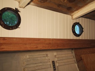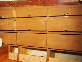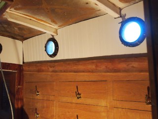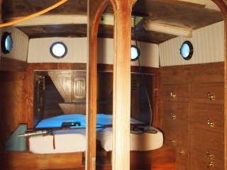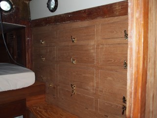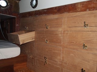 Leave no space unused we say . So now we have created this wall of drawers and below is a bench seat with storage . We also took out the bathroom wall liner that was used on the walls . We replaced it with a product we found , it is all plastic, so we love it for the boat. It is called bead board or wainscoting . We still have some of the trim pieces to go up and the same wainscoting to go up on the ceiling . At this point in this area we have storage under the bed in the front of the bed and down one wall . We will be working on the bathroom next, it is on the other side very small though . And in the available space between the bed and bath will be another wall of storage. We will update you as work progresses . Hope you enjoy the photos below. I will be finishing up sanding and staining tomorrow. I will post pictures later in the week.