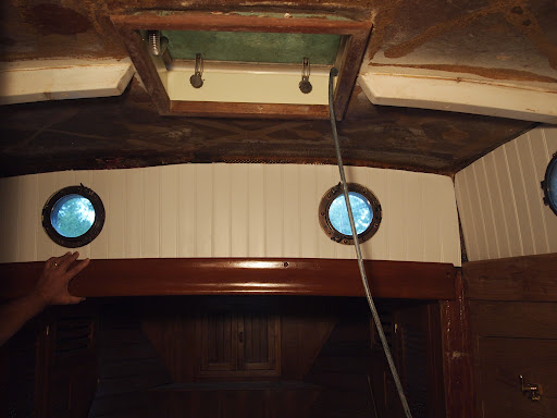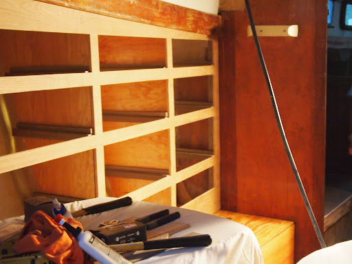 Leave no space unused we say . So now we have created this wall of drawers and below is a bench seat with storage . We also took out the bathroom wall liner that was used on the walls . We replaced it with a product we found , it is all plastic, so we love it for the boat. It is called bead board or wainscoting . We still have some of the trim pieces to go up and the same wainscoting to go up on the ceiling . At this point in this area we have storage under the bed in the front of the bed and down one wall . We will be working on the bathroom next, it is on the other side very small though . And in the available space between the bed and bath will be another wall of storage. We will update you as work progresses . Hope you enjoy the photos below. I will be finishing up sanding and staining tomorrow. I will post pictures later in the week.