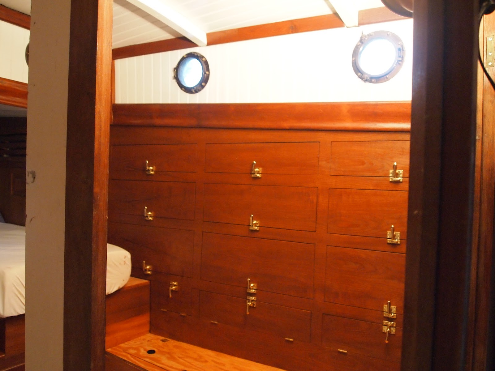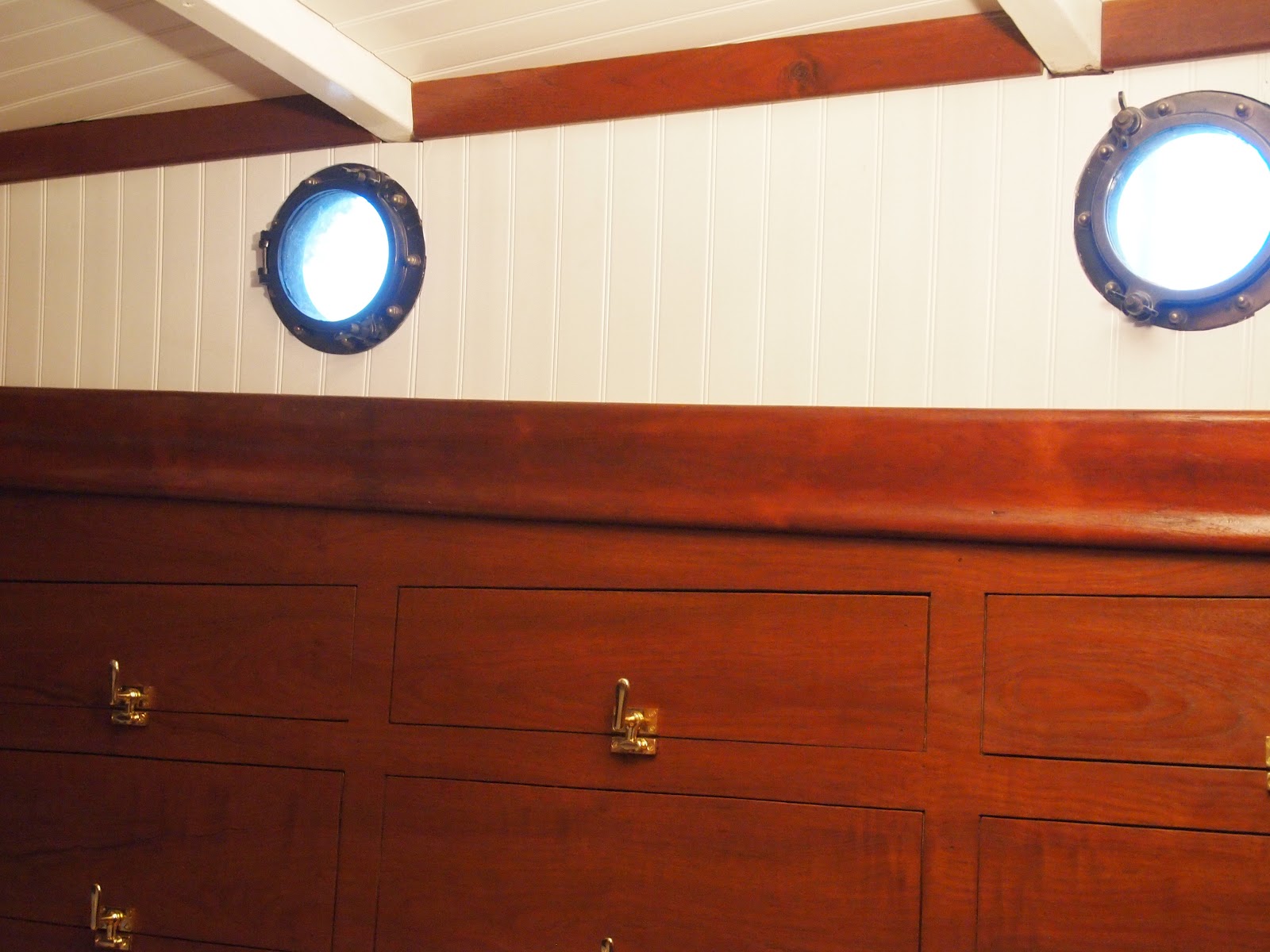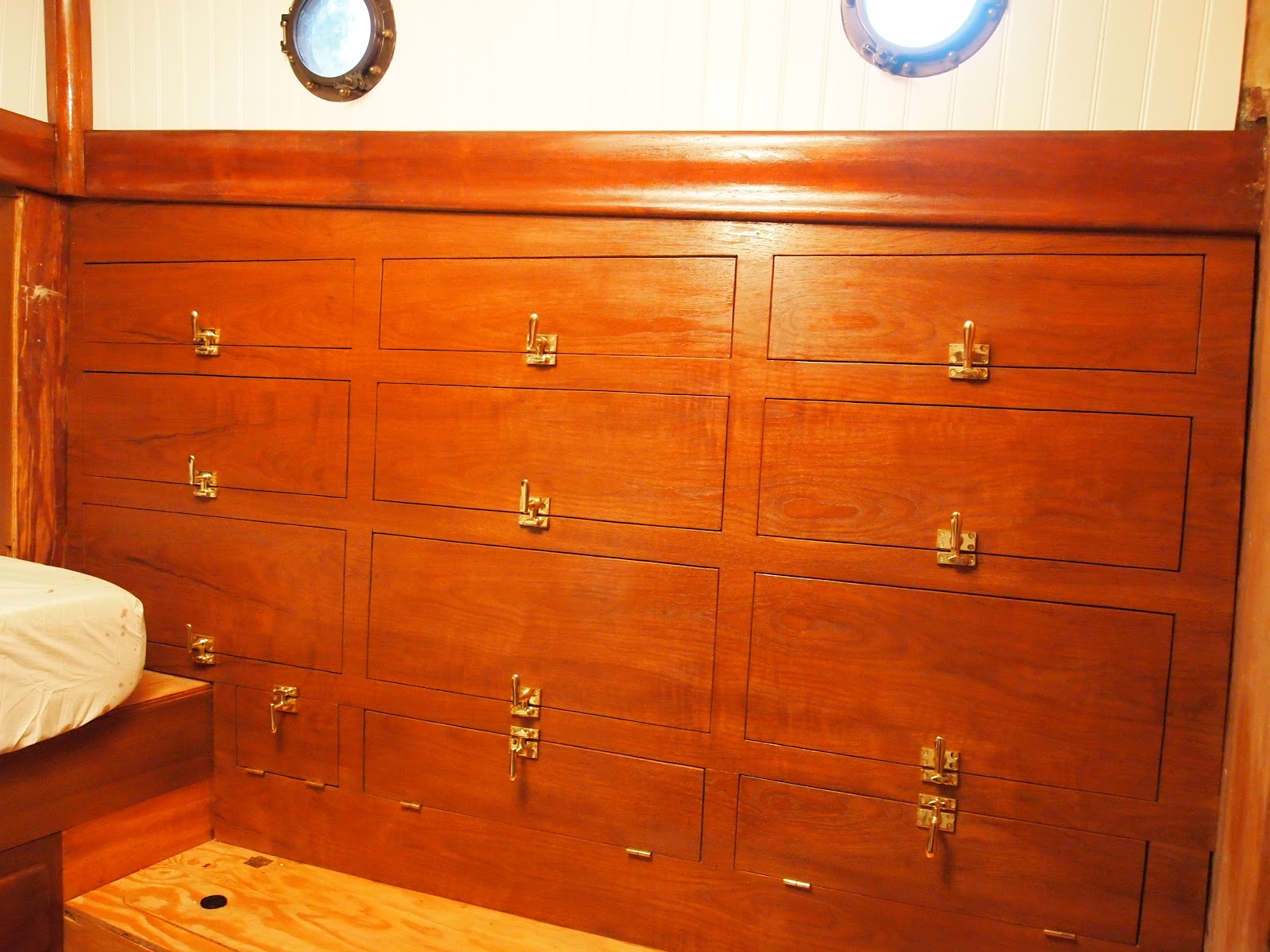 We have made progress ! As you can see we have the panels up around the port holes and the ceiling with the trim . Im sure we would be further along if we would have kept the original look. But as we keep moving forward it seems to be coming together with this new floor plan . We are now working on the area that the head will be I hope to have some progress photos soon.