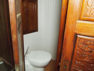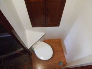 Yea ! we have made progress . We now have that crowning jewel the $1400 toilet in its home . Walls are up  and trim is in and all we have left now is the floor. Just an update about the room , this is also the shower . So the floor will be done in a teak floor with several layers of epoxy. This is a small space , but we made sacrifices for more storage space and living . The way we looked at it was you take at least one shower a day and while at sea we will have a shower on the top deck for long passages,  and you use the toilet several times a day, so we fitted this area for those needs.