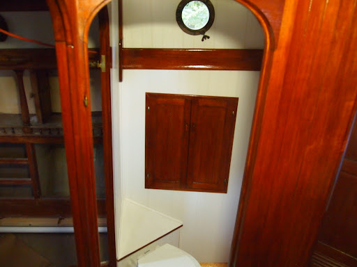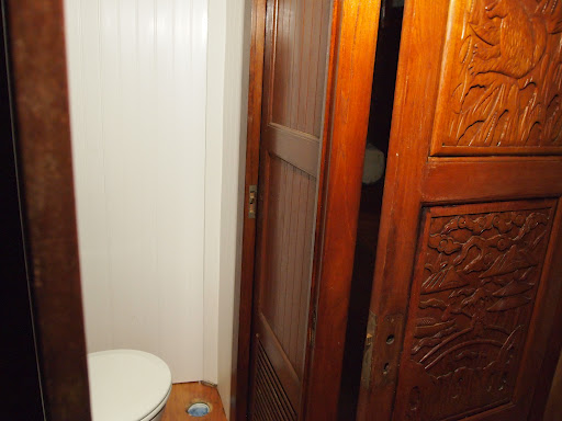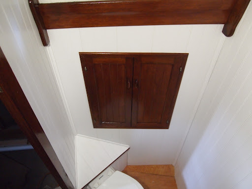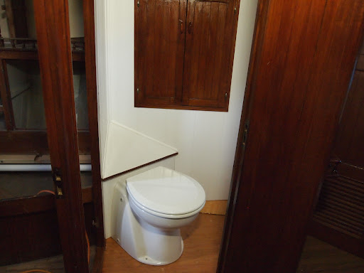 Yea ! we have made progress . We now have that crowning jewel the $1400 toilet in its home . Walls are up  and trim is in and all we have left now is the floor. Just an update about the room , this is also the shower . So the floor will be done in a teak floor with several layers of epoxy. This is a small space , but we made sacrifices for more storage space and living . The way we looked at it was you take at least one shower a day and while at sea we will have a shower on the top deck for long passages,  and you use the toilet several times a day, so we fitted this area for those needs.