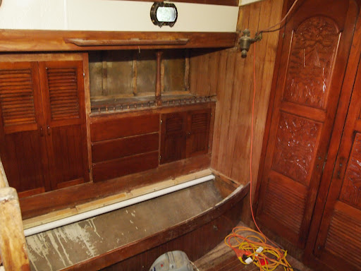 At this point we have sanded ,stained a portion of the salon . we have bead board to install and the floor to do along with some minor adjustments that will change the area to be more like a salon. Photos really do not show how nice it really looks. The light I have to use is a florescent work light so I will try and get some good daylight photos this weekend.
