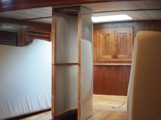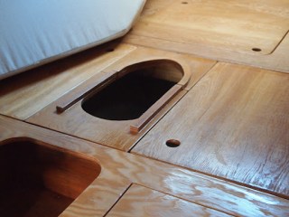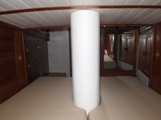 This is a cover for the mast in the berth that goes right through the bed. It was made from teak and PVC board with several layers of fiber glass for strength. This cover is really a decoration piece but will serve a few purposes, If any leaks happen around the mast the water goes down to the bilge also I really do not want to lay with the very large lighting rod. ( I know BIG BABY ) So it is mostly a decoration.