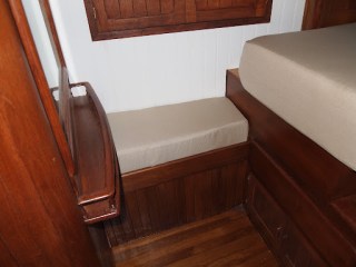 Some have and do complain about a few of our changes mostly about adding weight. And we too take that into consideration so we work with the lightest and strongest materials that we can find. Most of the work you see that has been completed was made by hand due to the fact you can not go out and purchase it. We were very lucky to have been given a large amount of teak to work with, The other materials are PVC board it is light weight will not rot and is easy to clean. In this area of the boat we actually took away weight, we made the head smaller removed two beds and walls. Storage storage, storage was and is the name of the game for us at least, I hate to see videos or photos of boats with everything in bags just stack up, mostly in the berth ( the place most say we will not use ) so my design hopefully has a place for everything that is why we mapped it out before we began, deciding just from sailing our other two boats just where everything needed to go and how to get to it. Neat and orderly is what I want, and the crazy thing about it I will have a book with everything we have and it will list where every item is, a little Martha I think but that is how I function, We have used memory foam for our bed and cushions it is a closed cell product and we have this on our bed at present, kinda pricy especially when go cutting it up, but we did and it feels great also a queen bed cut up made the bed in the berth and two cushions, WOW! To cover these we used material from http://www.sailrite.com in the berth it is a lighter material that can breath and for the salon I got something more rugged that could take a beating, and we went with a neutral color so I could jazz it up with accent color that I can change as my mood changes ( its a girl thing ). So there you have it in a nut shell this is why and where we are going with this project.