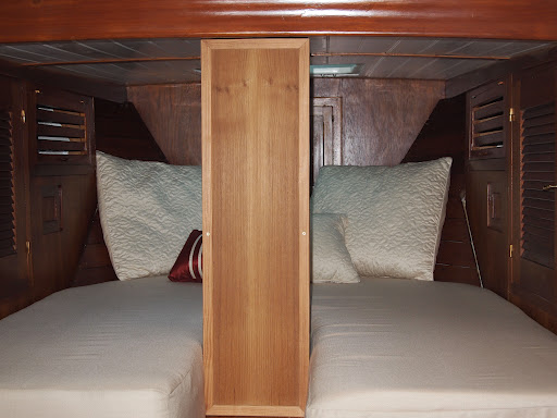 Some have and do complain about a few of our changes mostly about adding weight. And we too take that into consideration so we work with the lightest and strongest materials that we can find. Most of the work you see that has been completed was made by hand due to the fact you can not go out and purchase it. We were very lucky to have been given a large amount of teak to work with, The other materials are PVC board it is light weight will not rot and is easy to clean. In this area of the boat we actually took away weight, we made the head smaller removed two beds and walls. Storage storage, storage was and is the name of the game for us at least, I hate to see videos or photos of boats with everything in bags just stack up, mostly in the berth ( the place most say we will not use ) so my design hopefully has a place for everything that is why we mapped it out before we began, deciding just from sailing our other two boats just where everything needed to go and how to get to it. Neat and orderly is what I want, and the crazy thing about it I will have a book with everything we have and it will list where every item is, a little Martha I think but that is how I function, We have used memory foam for our bed and cushions it is a closed cell product and we have this on our bed at present, kinda pricy especially when go cutting it up, but we did and it feels great also a queen bed cut up made the bed in the berth and two cushions, WOW! To cover these we used material from http://www.sailrite.com in the berth it is a lighter material that can breath and for the salon I got something more rugged that could take a beating, and we went with a neutral color so I could jazz it up with accent color that I can change as my mood changes ( its a girl thing ). So there you have it in a nut shell this is why and where we are going with this project.