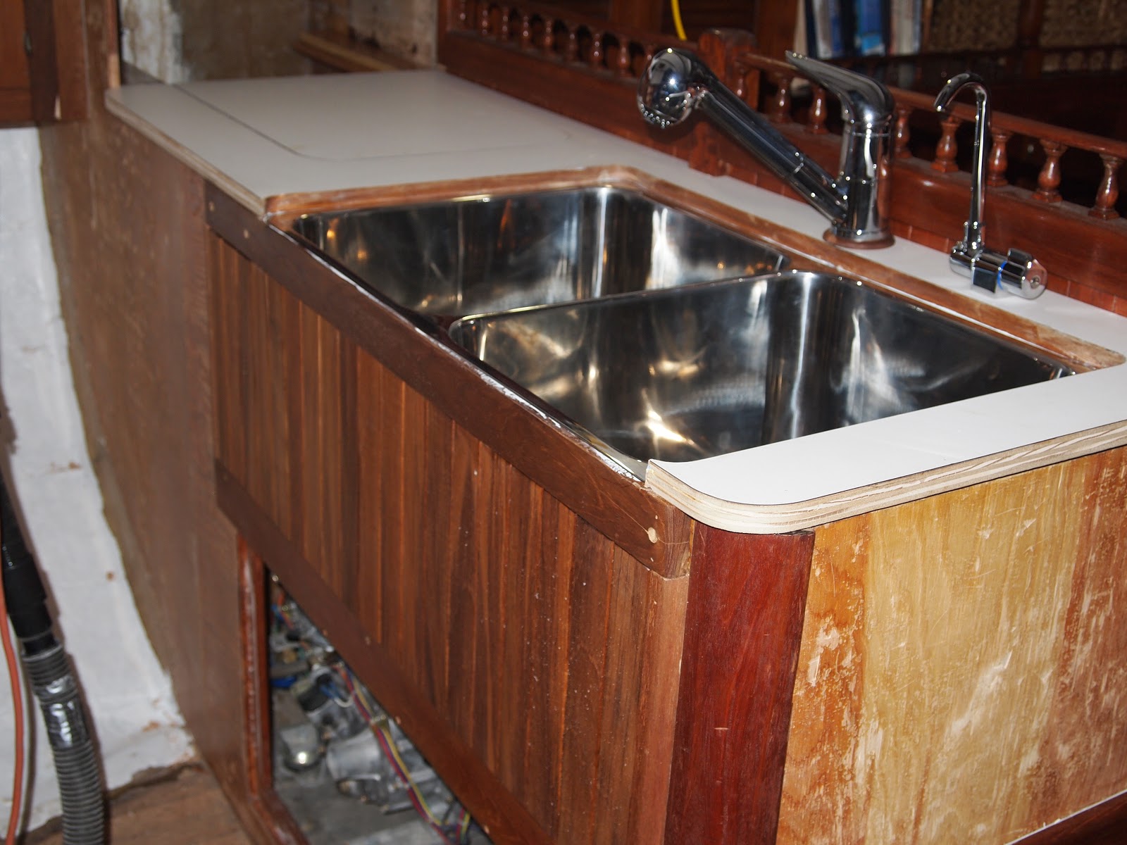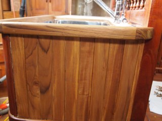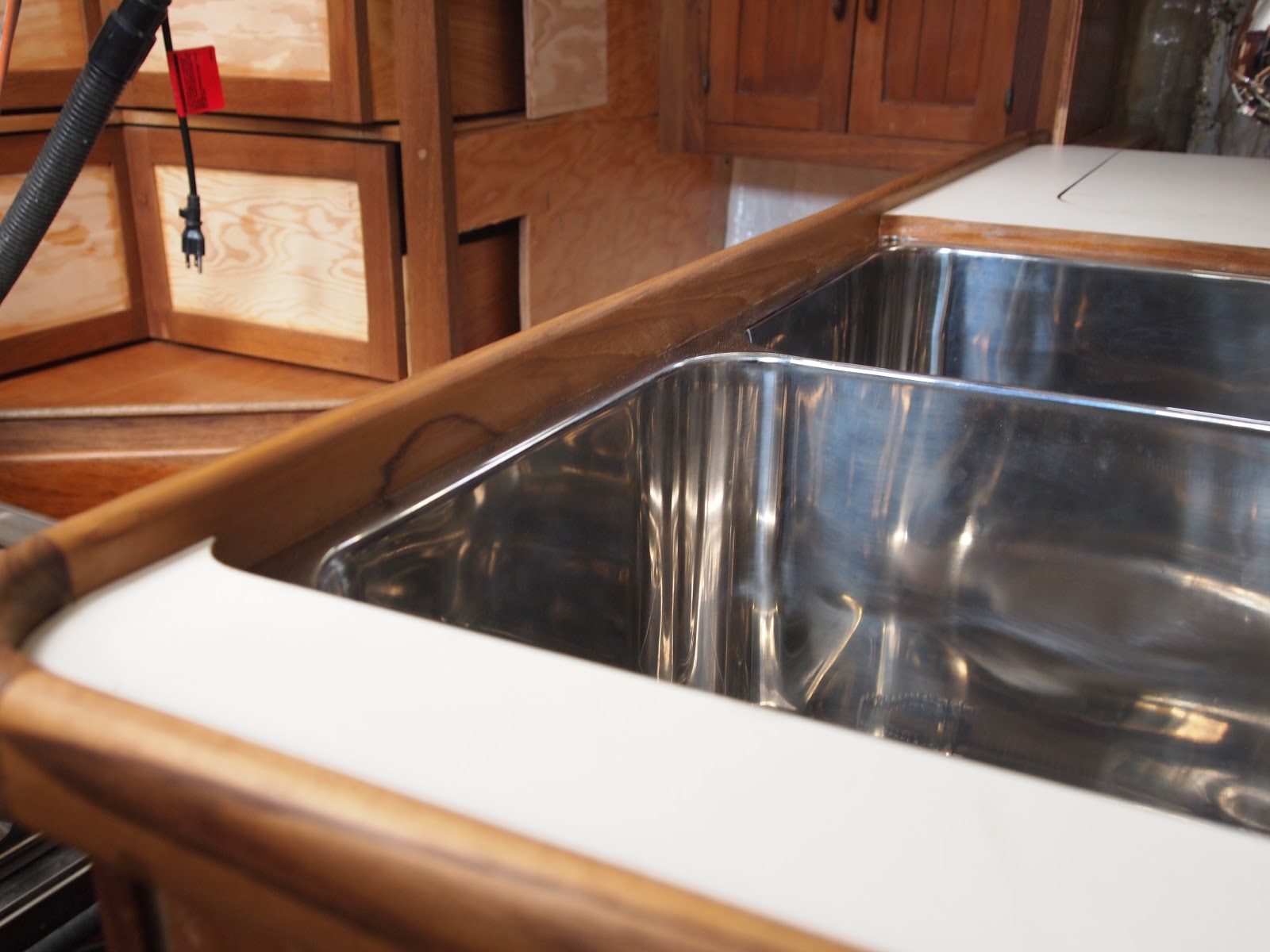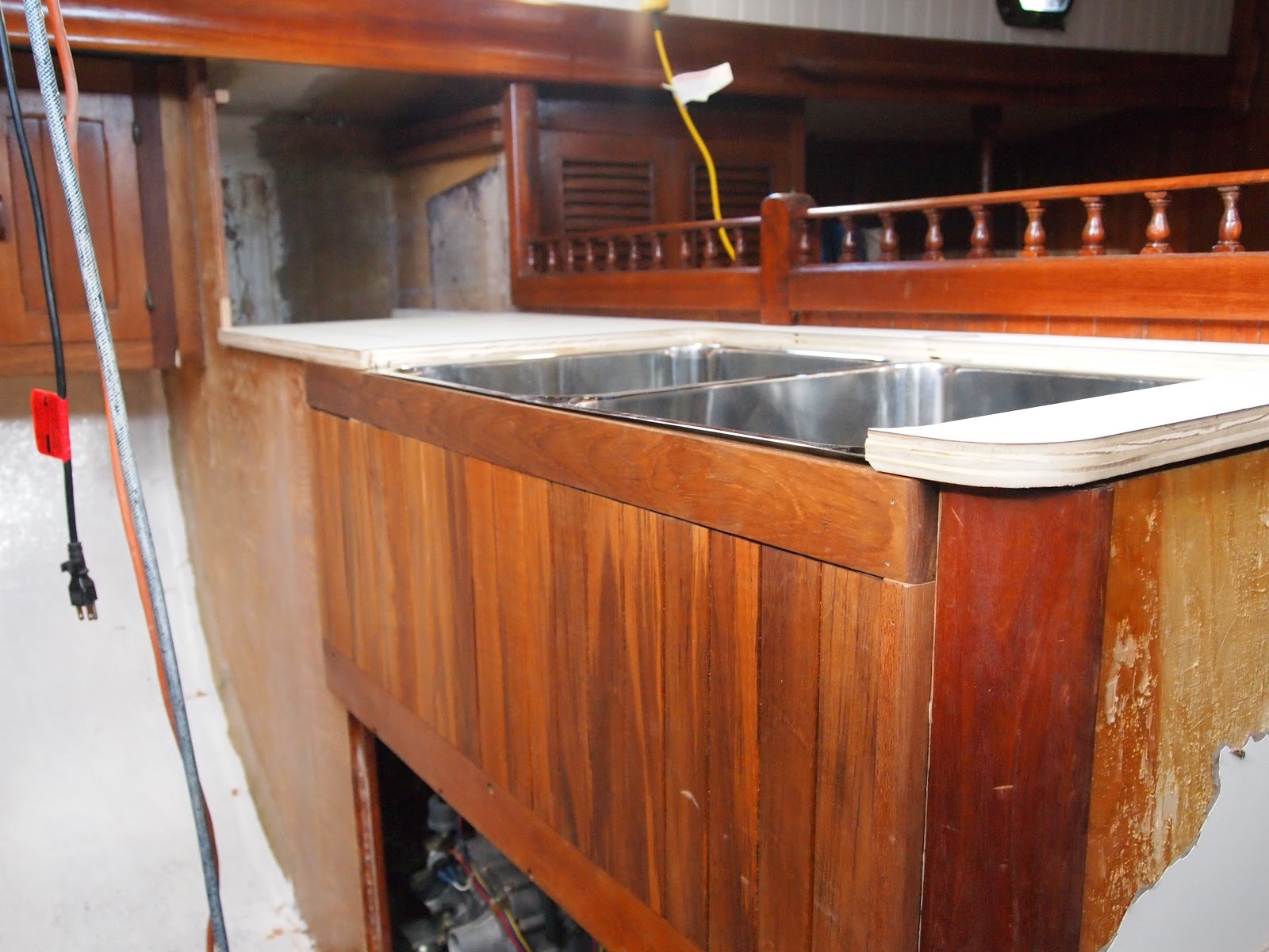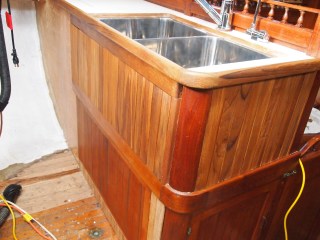 As we come out of our slumber we find ourselves back in the midst of the galley and what is to become of it. Finding yourself with challenges of teak work and details that mean more than just its look but of how it will withstand. On a boat things are not as they are in your home. You ask yourself will this leak will it break under the strain of a bad storm. So many things to think of, storage, water. Two types fresh and salt. And lets not forget WEIGHT, oh how important this is. You never think of how much something weighs when applying it to your home really. You only look at it for its beauty and its usefulness. On a boat it is only a challenge, finding materials that are strong, long lasting, light . But you find yourself needing to find the beauty and its usefulness. And I hope that is what we are doing with this refit. The teak work is slow, so many details. I have some updated photos of the sink area. This has been a challenge, only due to the fact that in a Formosa the galley was in the starboard section. So we completely moved it to the port side. In this area you would have found bench seating and a table. If you recall we made drastic changes in the v-berth also. While finding ourselves loving the changes we have also found it to be very laborious.We still have sanding and staining to do with more teak vainer to go up. As the weather warms and the days become longer we will punch through. Until next time my friends.