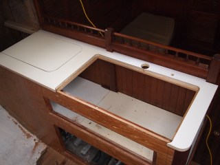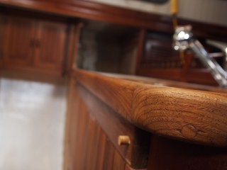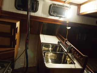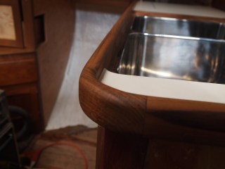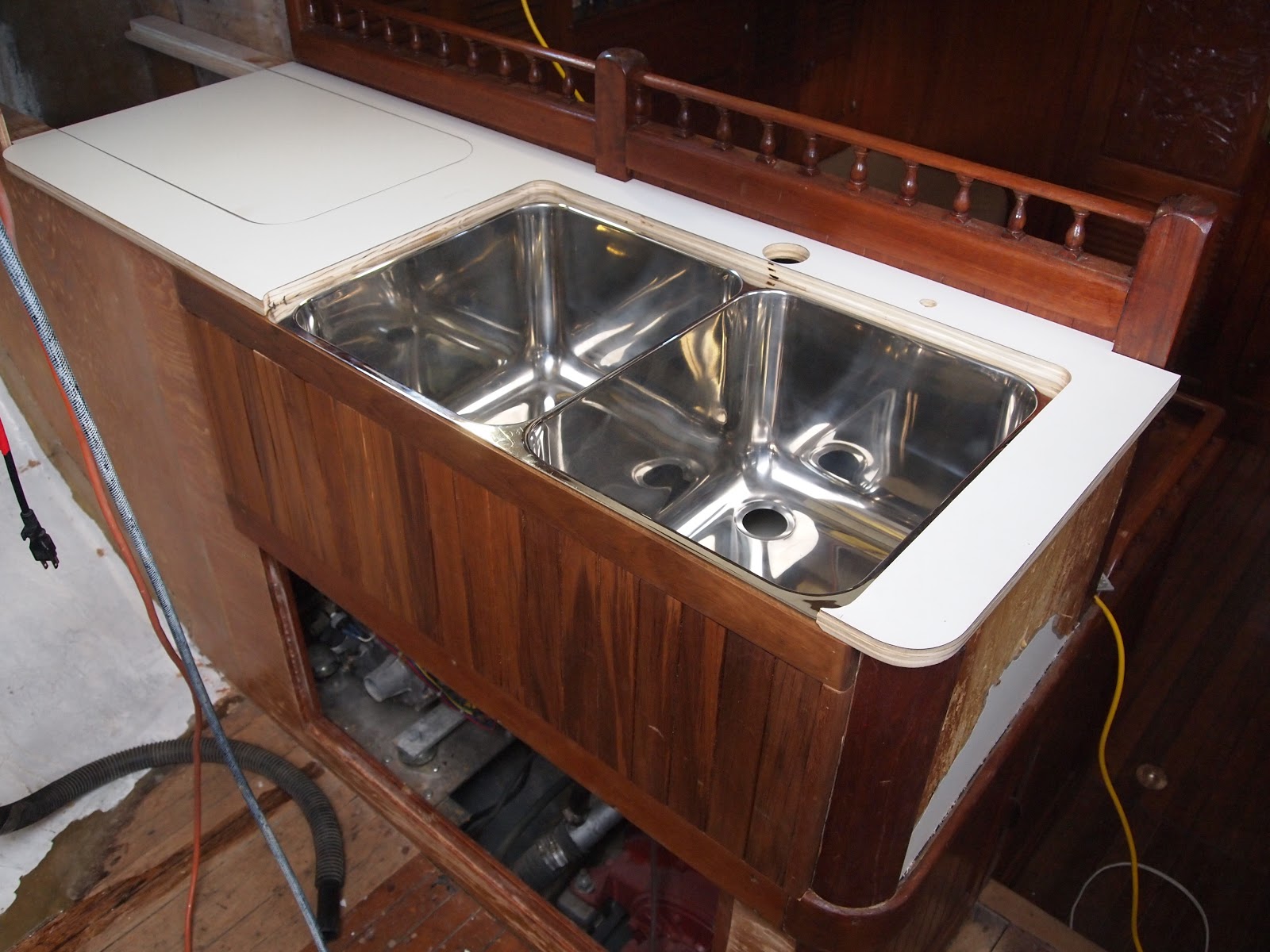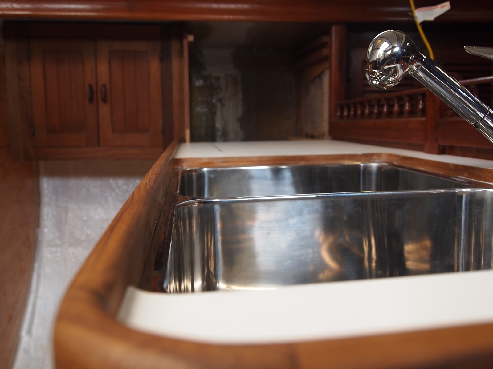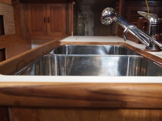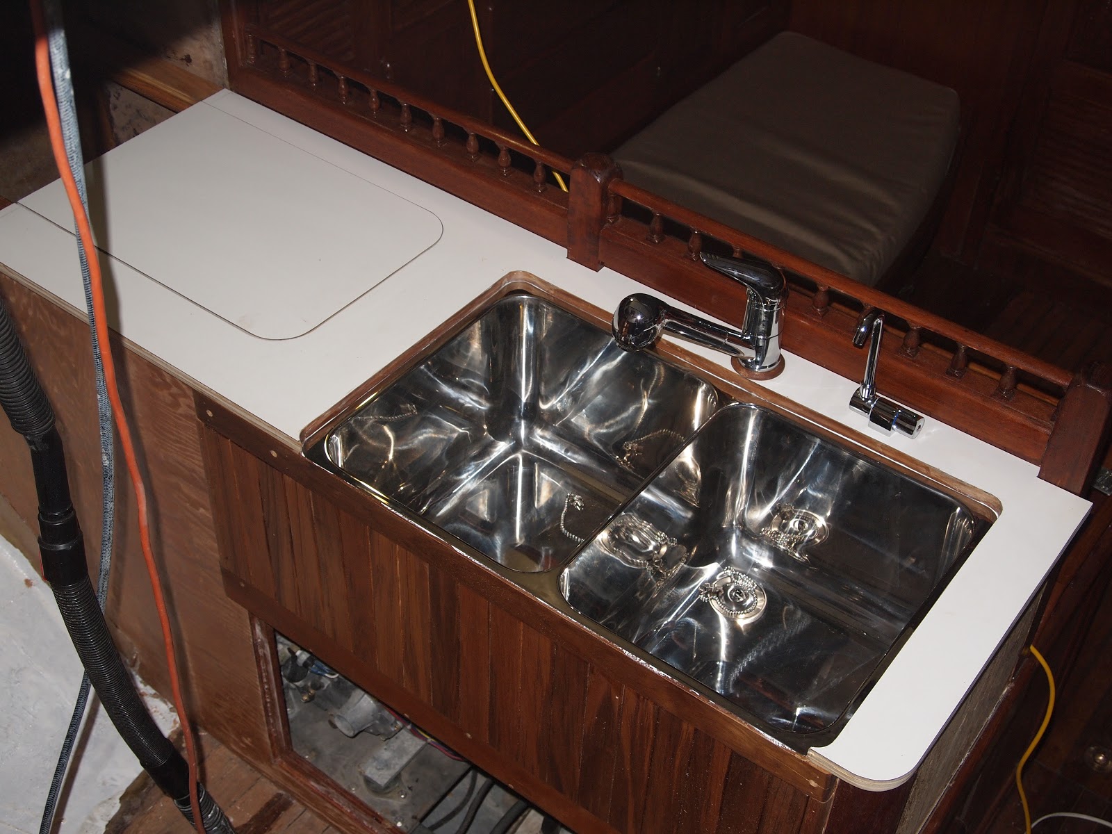 As we come out of our slumber we find ourselves back in the midst of the galley and what is to become of it. Finding yourself with challenges of teak work and details that mean more than just its look but of how it will withstand. On a boat things are not as they are in your home. You ask yourself will this leak will it break under the strain of a bad storm. So many things to think of, storage, water. Two types fresh and salt. And lets not forget WEIGHT, oh how important this is. You never think of how much something weighs when applying it to your home really. You only look at it for its beauty and its usefulness. On a boat it is only a challenge, finding materials that are strong, long lasting, light . But you find yourself needing to find the beauty and its usefulness. And I hope that is what we are doing with this refit. The teak work is slow, so many details. I have some updated photos of the sink area. This has been a challenge, only due to the fact that in a Formosa the galley was in the starboard section. So we completely moved it to the port side. In this area you would have found bench seating and a table. If you recall we made drastic changes in the v-berth also. While finding ourselves loving the changes we have also found it to be very laborious.We still have sanding and staining to do with more teak vainer to go up. As the weather warms and the days become longer we will punch through. Until next time my friends.