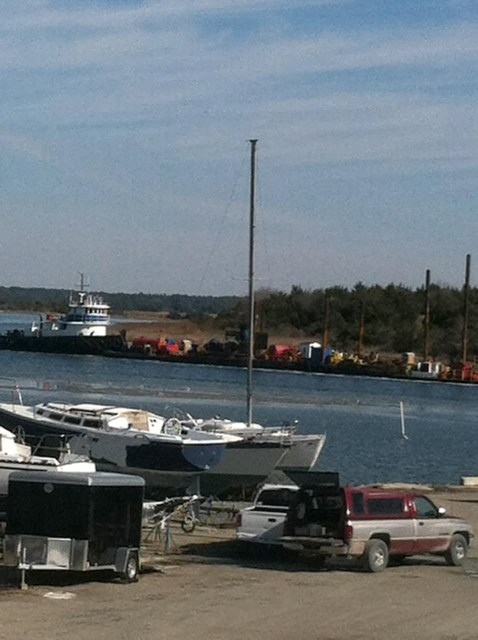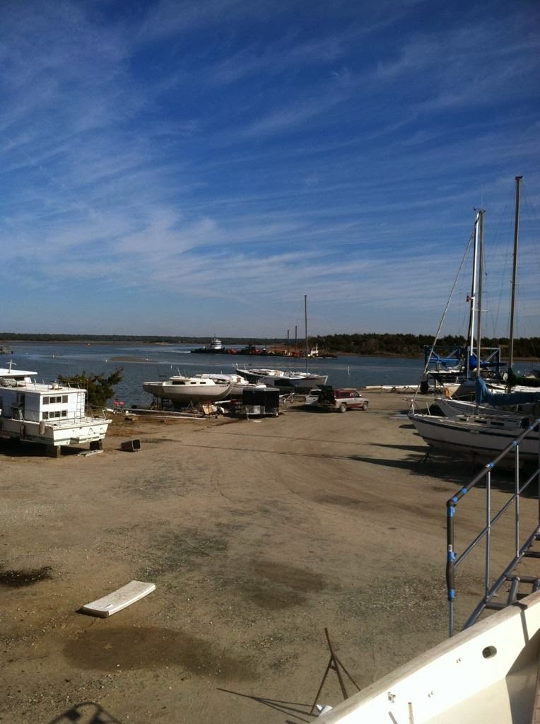 The only saving grace is the dock worker also lives at the dock and he handles hoarding Tom in a gentle way so all is well . Burt is making friends though . It seems there are several people working on their boats in the yard . This weekend will be filled with just settling in . He has located our office in Top Sail and calculated his driving time for the start of work on monday. So life in the DYI yard has begun .
