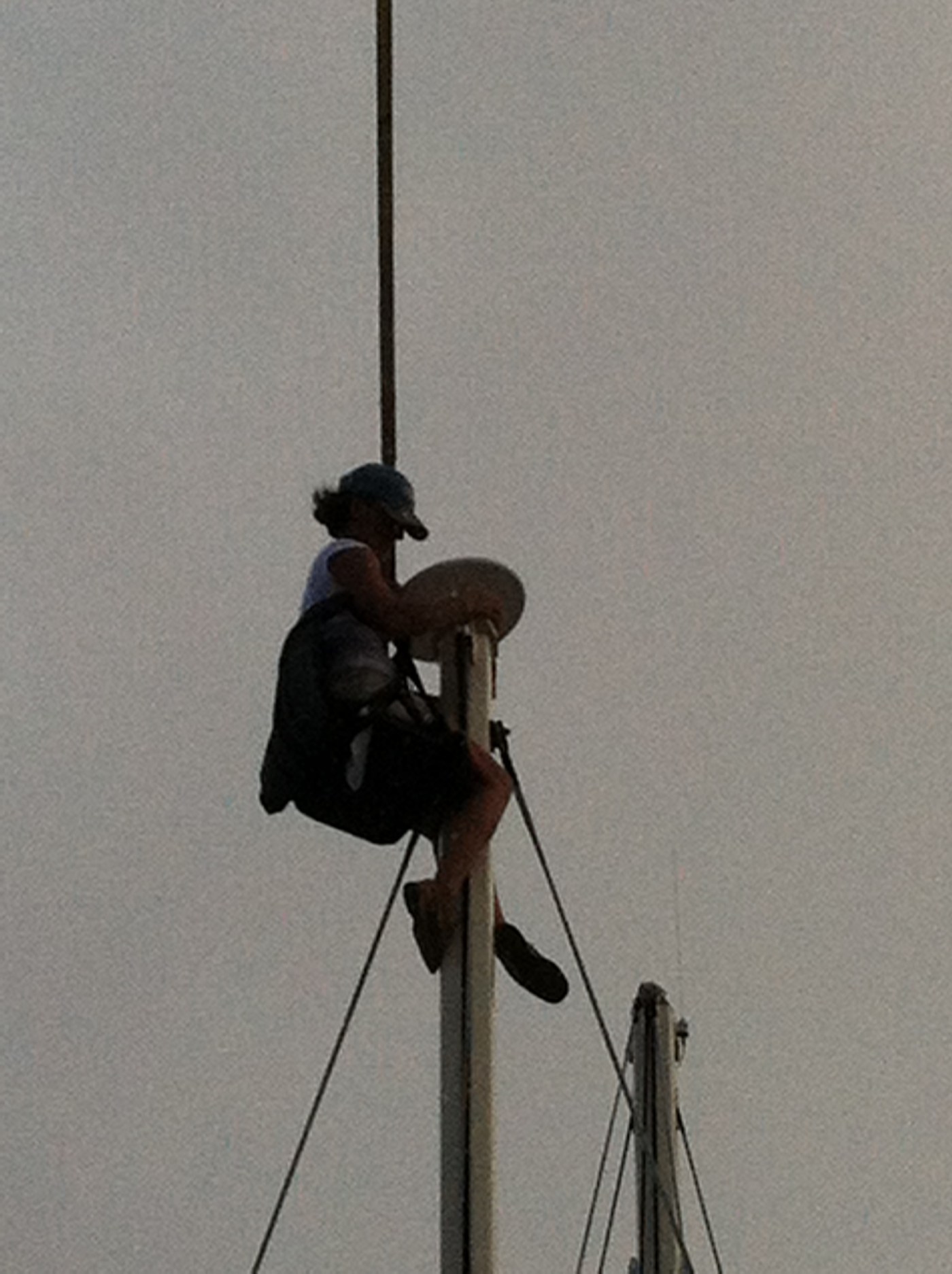 A short video of the installment of the mast. One of the cameras had a failure so much is missing that I wanted you to see. I am working on a video showing the splicing of the rope rigging. And if your wondering about the picture above it was a quick way of rigging some stuff. I had the crane operator hoist me up real quick to fix that antenna.