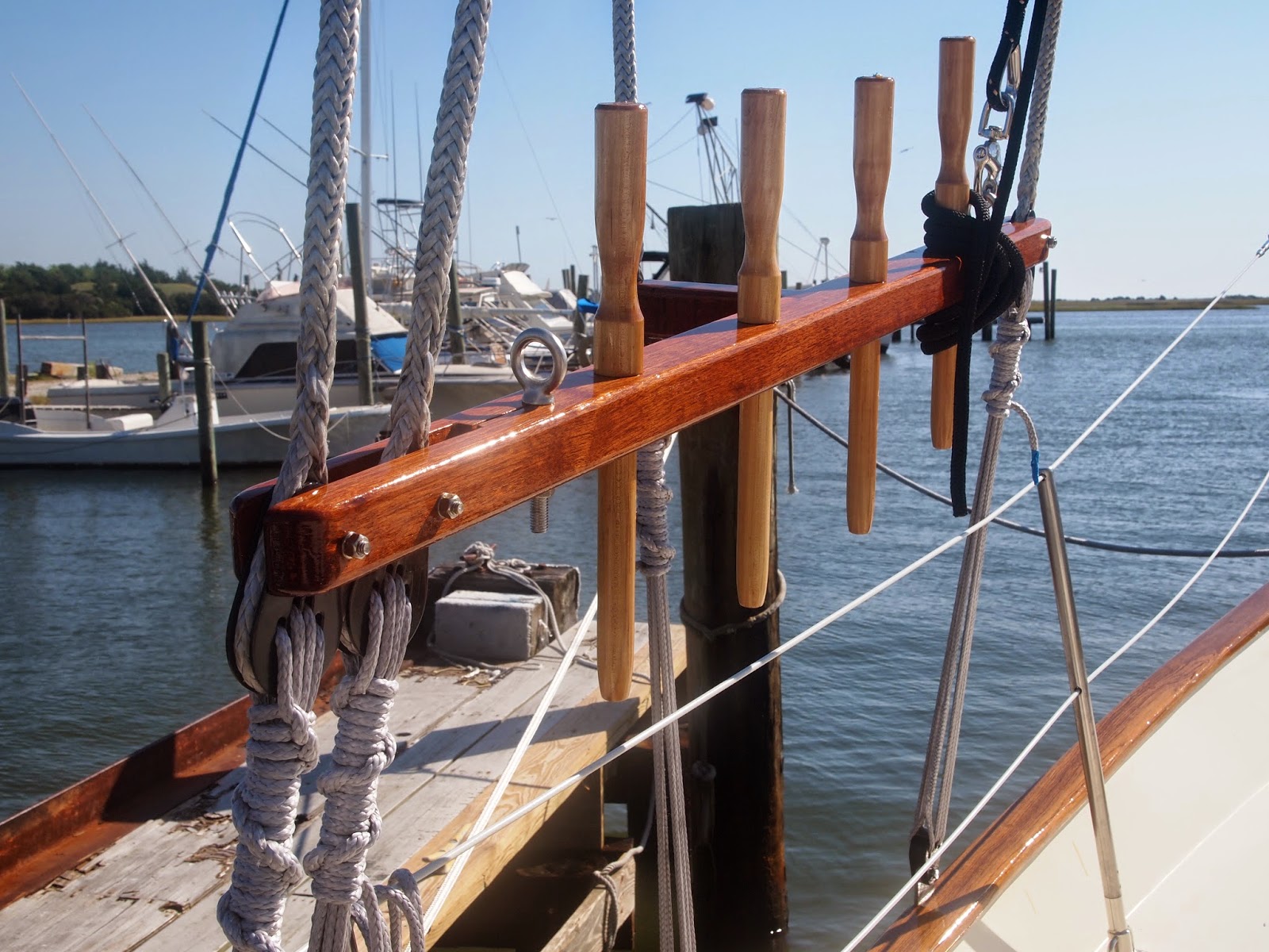 I think Burt is most proud of his latest project these Pin Rails. We purchased some reclaimed Markore/African Cherry They turned out to be a great match and addition to the boat.