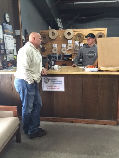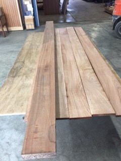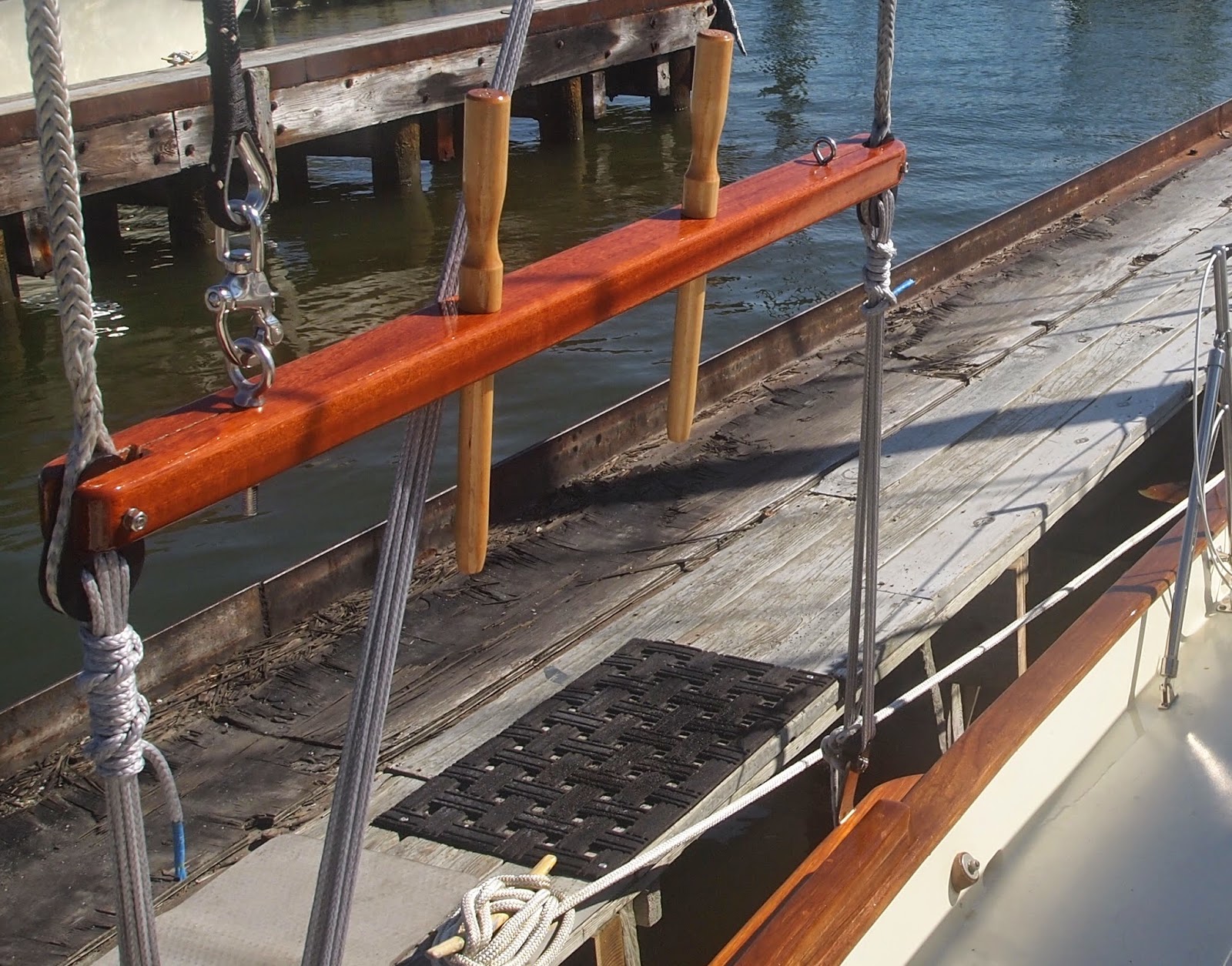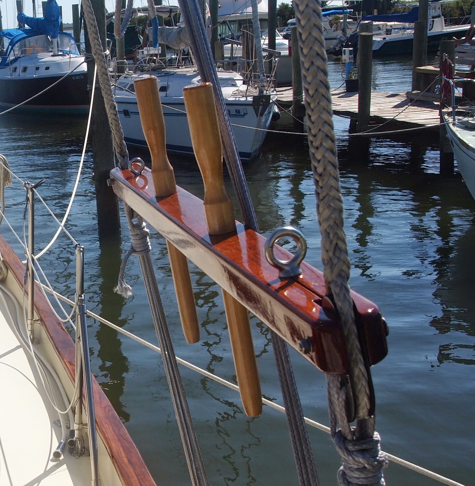 Jeff Brooks a really great young man helped us today purchase more wood for projects. Our journey takes us out to Beaufort NC to the Mill Outlet a great little place tucked away in this town. After much research we were able to get information about this place. They are the warehouse that all of the specialty wood shops get their wood, Great! lets take a ride and try our hand at buying direct and see if the price goes down and the best thing was , YES! it was worth the drive this same wood from a specialty shop was $12 a board foot and here it was $7. Now I call that a savings. This wood is Sapele an African Mahogany and we love it. It is light red-brown color with pink overtones and the good pieces have darker ribbon stripes that undulate from one end to the other. It has a tight grain pattern that won’t fuzz with hand or power planing. This wood finishes beautifully with a lot of character. Just be aware of one thing…. Stock up on Saw Blades, Drill Bits, and watch out when putting in any screws, because this wood is dense! We used it on the pin rails and look at that shine with only two coats of Epifanes. The best thing is they still look the same and I can not say that about the teak, and I have put 12 coats on it so far. So winner winner chicken dinner!