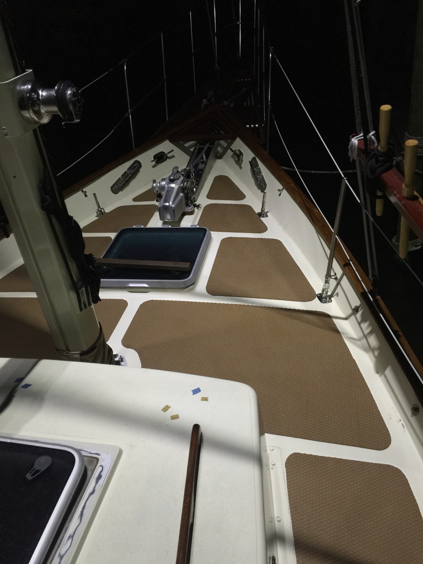 An all day job. 11pm we finally completed this task. We first made templates of each piece and laid them out in order to define the layout. And at $180 a sheet we need not make a mistake. So here it is and if you use your imagination like I did it looks like a spider. I’ll let you decide . Still trying to fall in love with the teak color though.