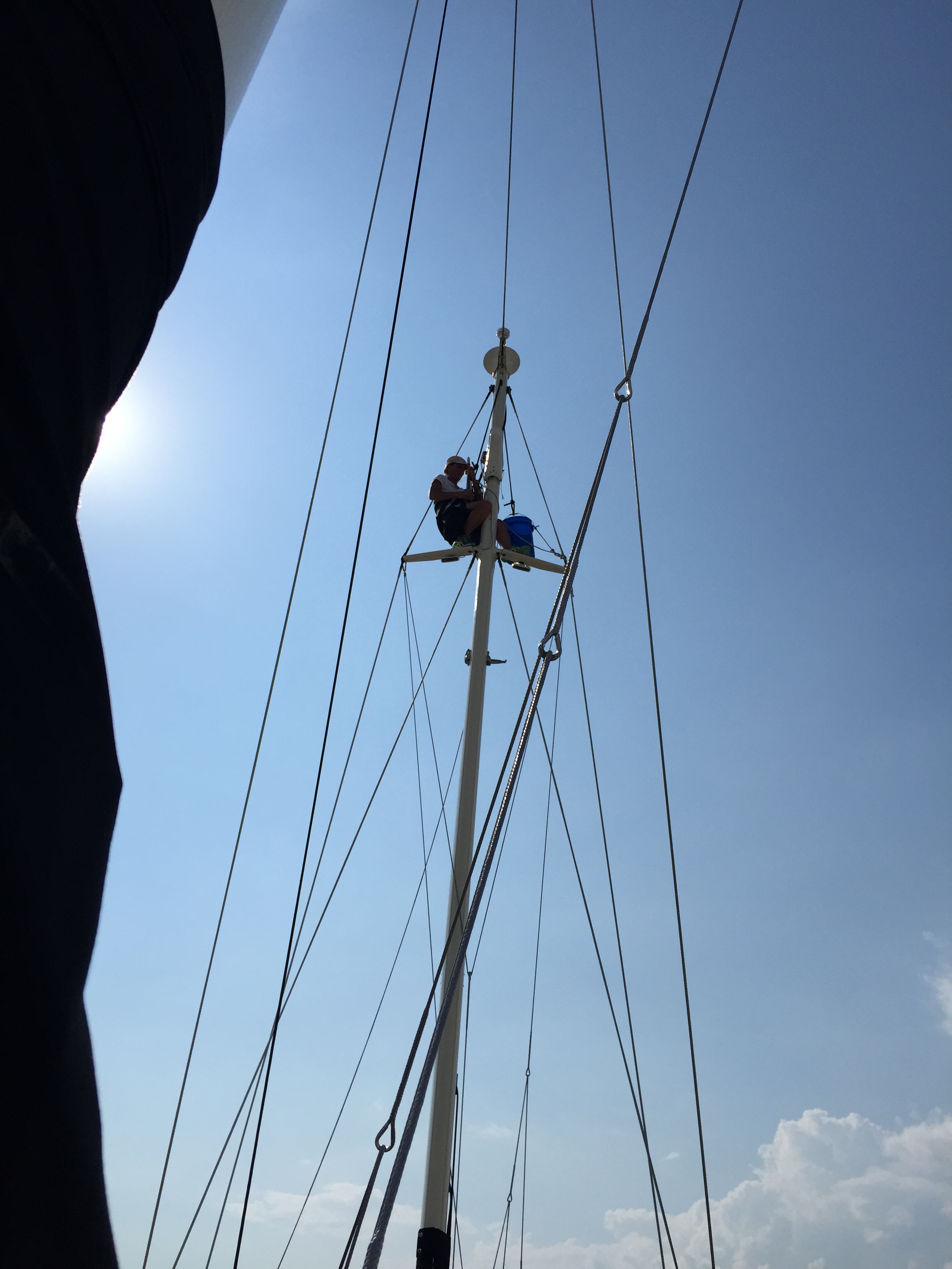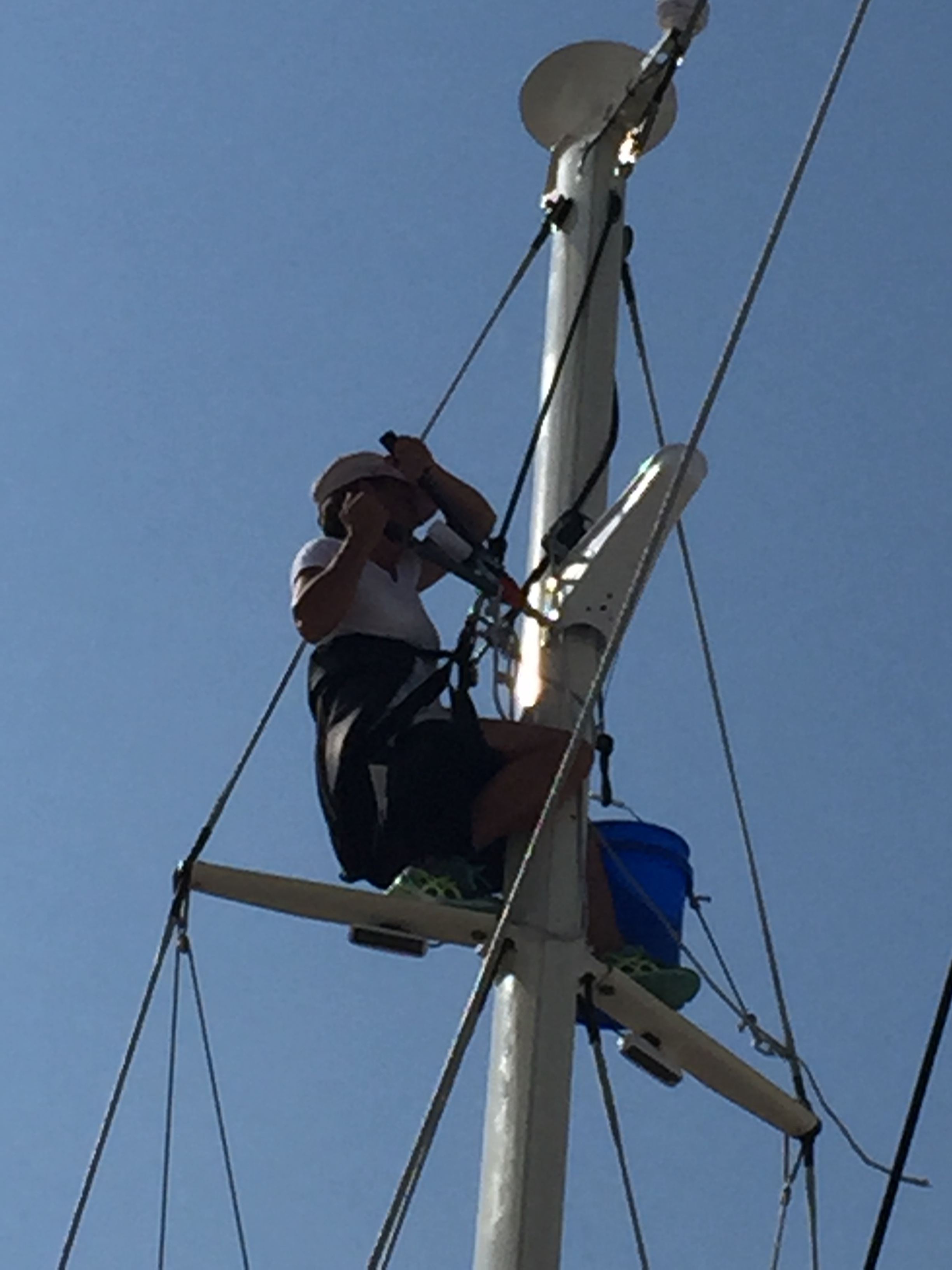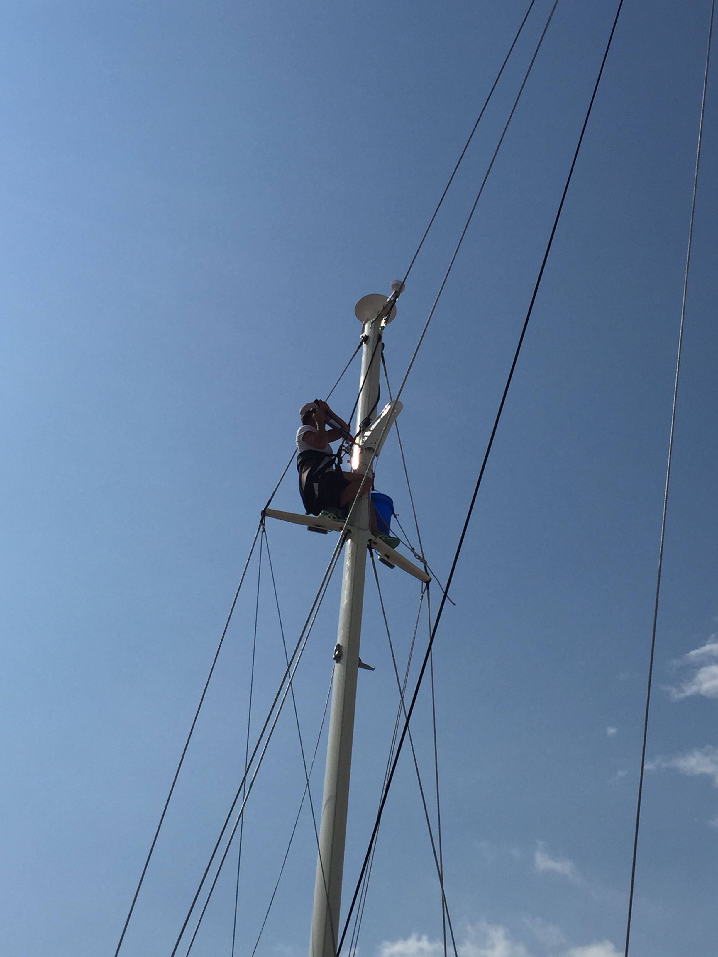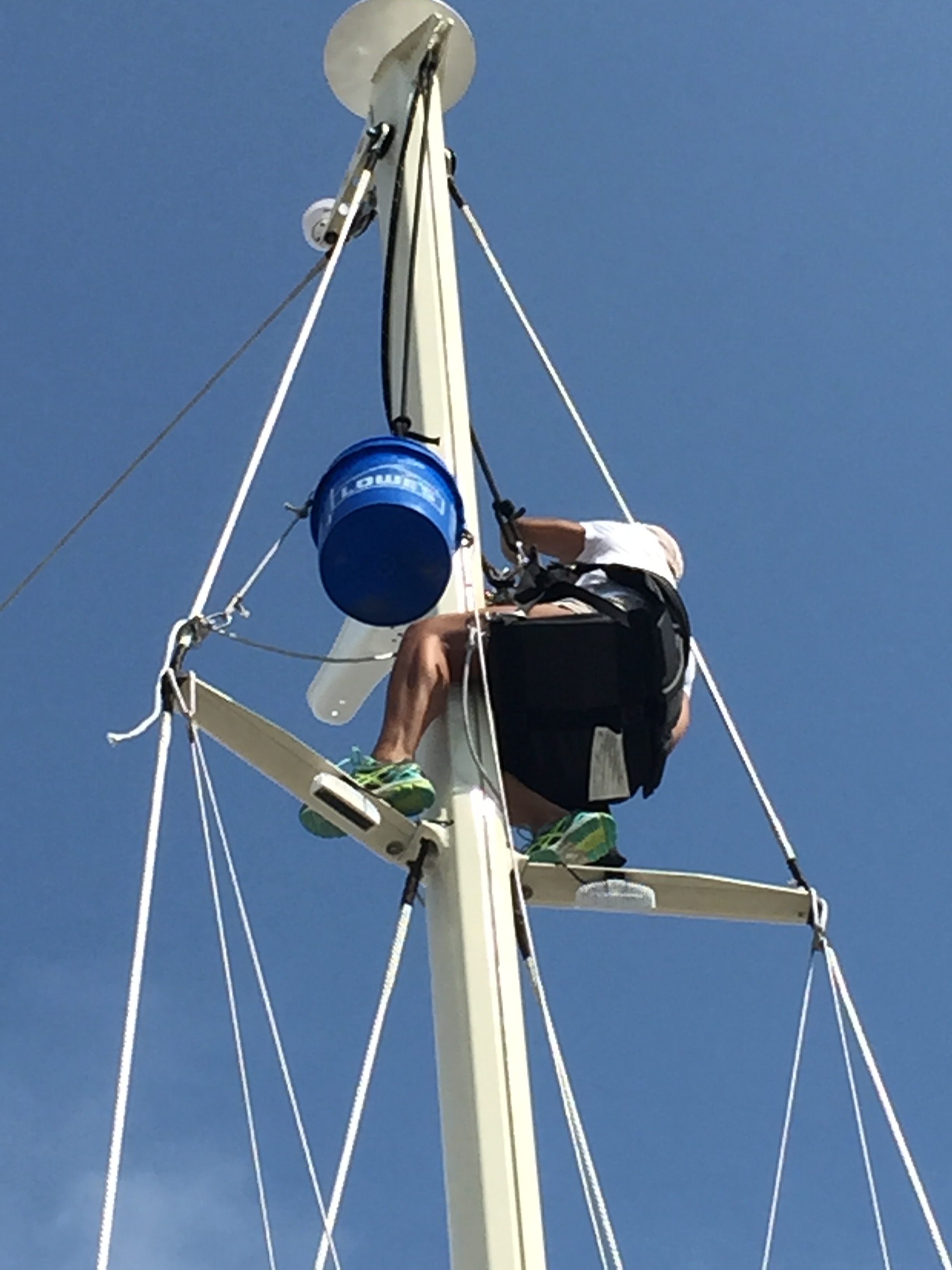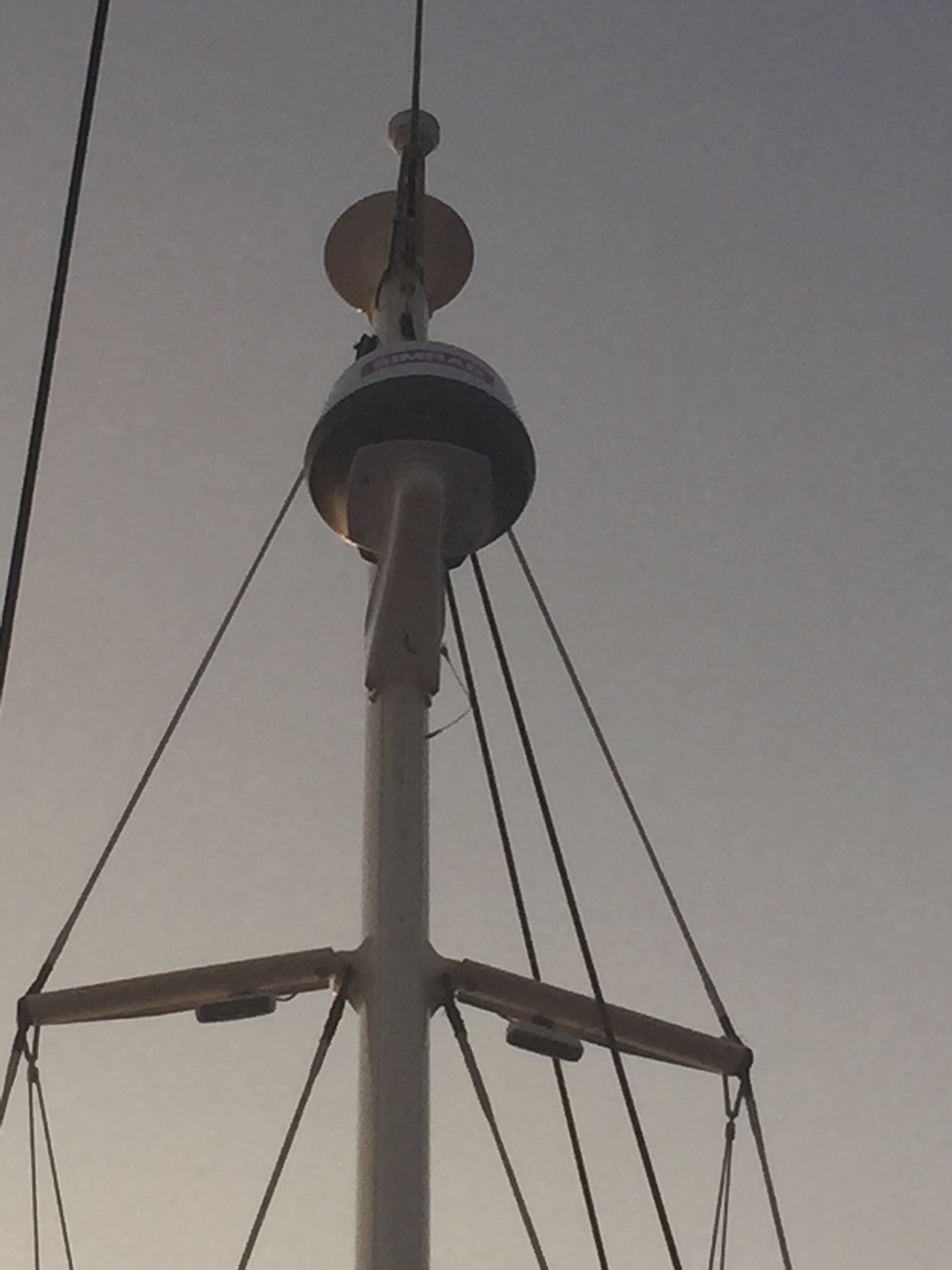 Well our weekend included the last of the gear loaded on the mast. We now have the radar and sirius weather attached. This job as always is up to me to perform and I must say Burt is lucky to have someone who works 40′ in the air all day long, As some of you may know working up a mast is a hundred times harder and just imagine on a swept mast. I managed to mount both brackets and load up that big ass radar! Holy hell! this was a beat down and I’m so glad its complete. Now just a few minor add on’s and we can call this done. Funny thing, we always wondered when would we or would we ever get to this point, a time where we have installed everything major and its just down to little stuff. This week alone we have noticed there is time to sit out on the boat in the evenings and have dinner or go for walks on the beach. After our on-call in a week we should be able (weather permitting) go sailing and test out the new equipment.