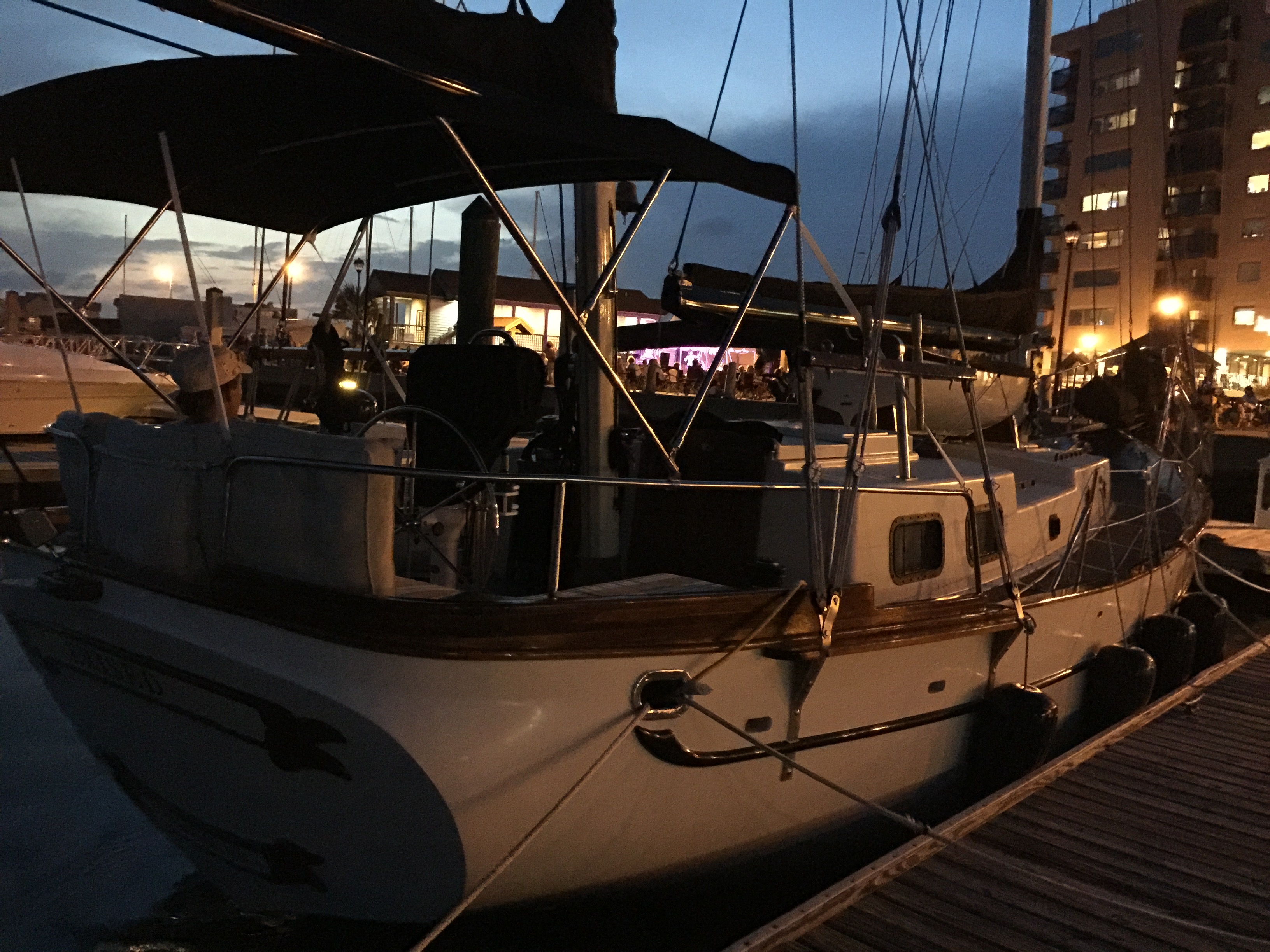 and here we sit……………we didn’t quite get the Zig and up on the shoal we sit. Now it is past low tide so we had decided to wait for the tide to lift us off or at least enough for us to back off and try again. After a 20 min of waiting we had a couple of good samaratains come along and pull us off and on set us on our way. In the midst of things I had time to look at Active Captain and prepare ourselves for each upcoming disaster and holy crap its at every inlet every turn and even on some straight aways. Im asking myself is the ICW fun? Is it relaxing? HELL NO!!! We managed to miss the next set of traps and feeling relieved. We find ourselves needing fuel so we stopped in New River Marina to fuel up and give pepper a bathroom walk. Now the last time we stopped at this dock we received a big walloping slam from a passing power boat and it cracked our toe rail so this time I put out all the fenders. Everything seemed to be going well until we needed to leave, now the wind had picked up and was keeping the boat plastered to the dock so in our efforts along with the workers we managed to get off the dock and strip all of the varnish down to the wood off the toe rail. Seems we hate that place too along with the ICW. So on we go now and we have 3 bridges to contend with so we need to time them out. Now we raise the sails and take advantage of the downwind run. Our first bridge is the Surf City swing bridge and it is closed to boat traffic until 2pm due to construction repair between 8am and 2 pm. So our arrival of 2pm was insane and we went right through no wait, now you would say to yourself today is going pretty ok one grounding not so good but we made the first bridge in good time and we are doing 6 kts so maybe this will work out. Our next bridge is the figure eight so we call ahead and we are good to go, now he was a bit slow to open in order to slow down we let out the boom released the jib and slowed for the opening and its perfect we zip right through. It is now dark so seeing the danger zones becomes a tricky game you play. Time to really keep a watchful eye, ( in the dark).